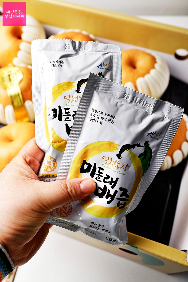 그리고 제가 좋아하는 도쿠가와 농장의 미들레 배즙도 정말 좋습니다.배말고 배주스 선물도 찾으신다면 이것도 추천드려요^^ 정말 진하고 달콤하고 맛있어요. 요즘 코로나 이후 기침이 심해서 이 배주스를 열심히 마시고 있어요.