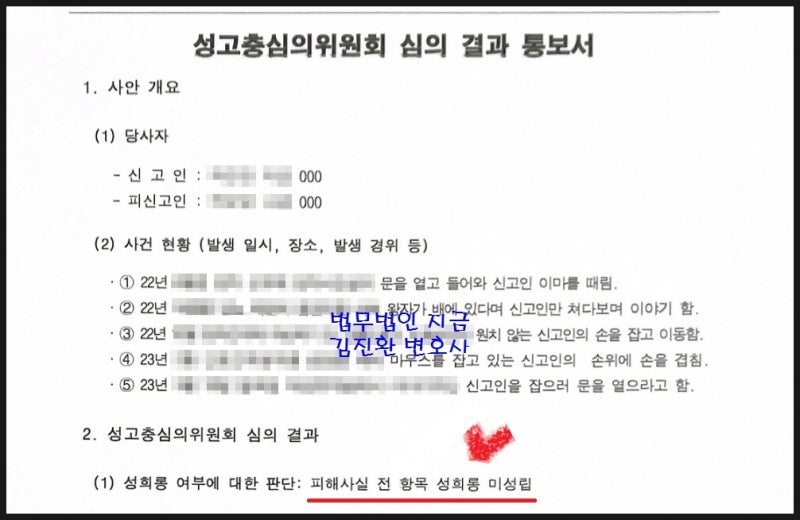 이 과정은 징계위원회와 달리 심의 대상 사실을 피청구인에게 미리 알리지 않는 특징이 있다. 따라서 제보를 받으면 어떤 정보를 받아들일지 짐작하고 그에 따라 대응해야 할 수도 있습니다. 따라서 개인적으로 처리하면 올바른 방향을 찾기가 어려우므로 처음부터 법률적인 조언을 받는 것이 필요합니다. 또한, 해당 결정은 직접적인 불리한 처분으로 보기 어렵기 때문에 행정심판이나 행정소송의 대상이 되기 어려운 특징이 있다. 따라서 절차를 거쳐 성추행이 성립한다고 판단되면 이를 뒤집기는 어렵다. 다만, 추후 징계결정 과정에서 항소 등 항소절차가 제기될 수 있으므로 문제가 있을 경우에는 반드시 해당 시기에 법정대리인의 조력을 받아 대응해야 합니다.