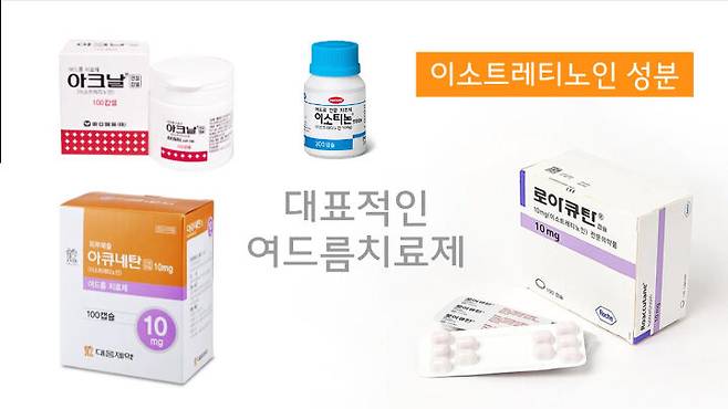 여드름 치료법에는 약물치료, 물리치료(밀어내기), 레이저치료 등 다양한 방법이 있습니다. 여드름약도 바르는 약, 먹는 약 등으로 나뉩니다.여드름을 먹는 약에는 피지 조절제, 항생제, 피임약 등이 있습니다. 이소티논, 로아큐탄 등은 피지 조절제에 속하는 약입니다. 전문의약품이라 처방이 없으면 사용할 수 없습니다.(이소티논, 로아큐탄은 제품명과 제약사만 다를 뿐 성분과 함량은 같은 의약품입니다.) 피지 조절제 – 여드름 먹는 약