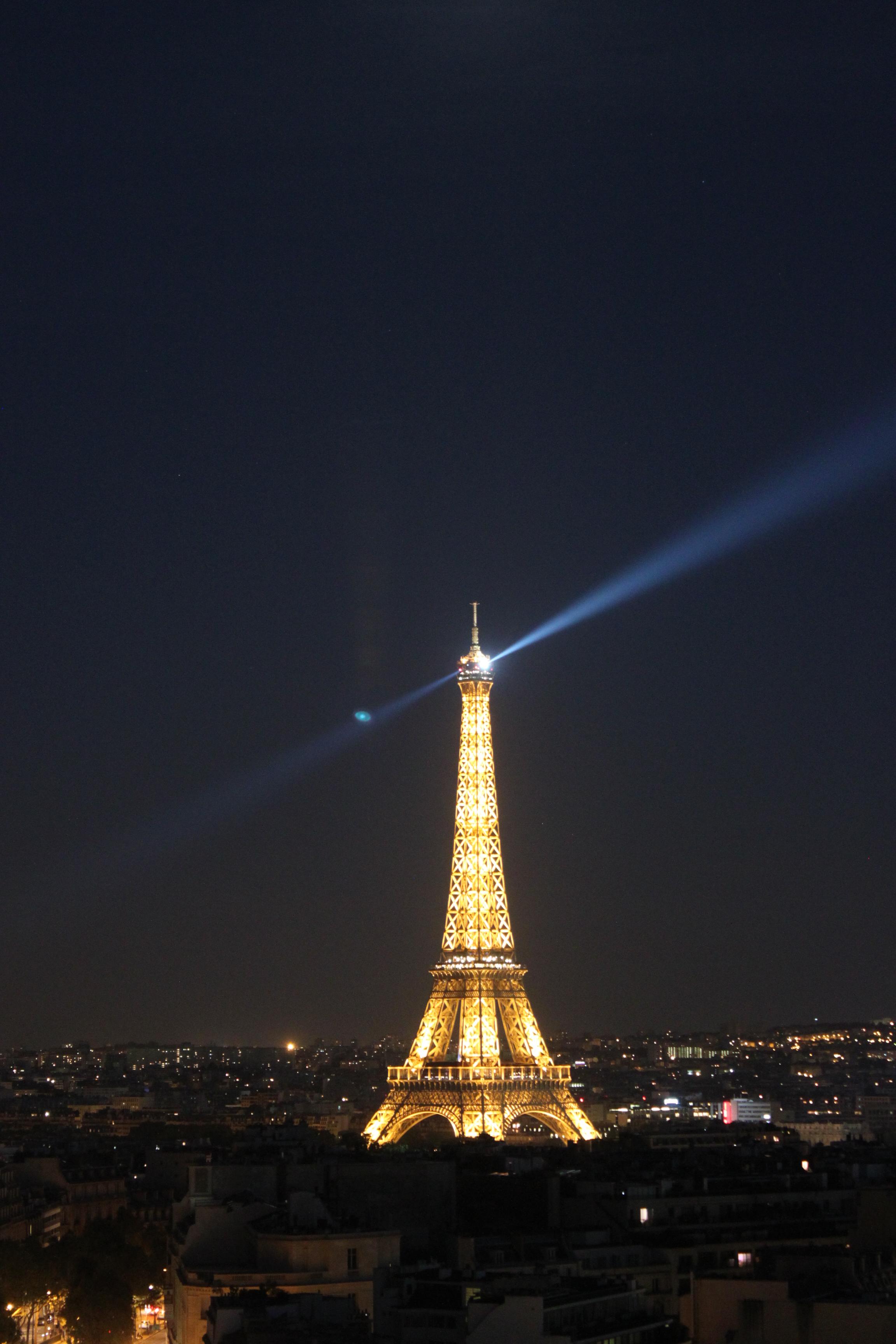 에펠탑에는 노란 조명이 켜지고, 꼭대기 조명은 등대처럼 회전하며 사방을 비추었다.