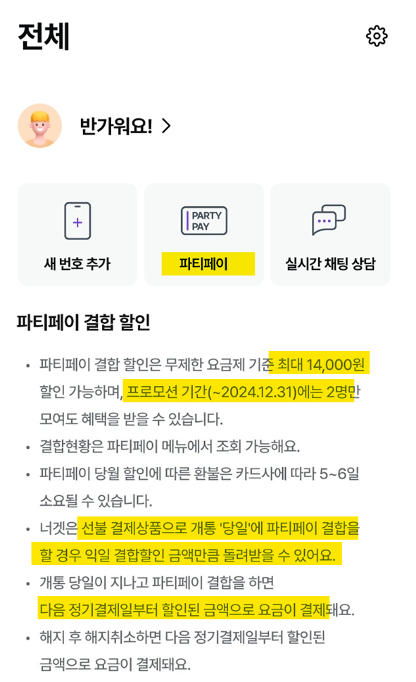파티페이란 무엇인가요? 요금제 신청 후 모르는 사람과 결합하면 최대 14,000원까지 할인받을 수 있는 결합방법이에요!
